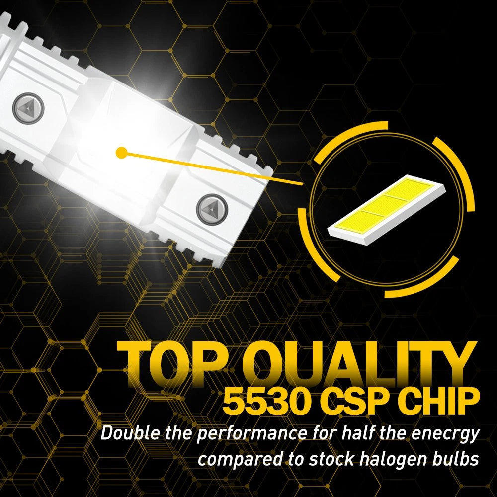 -6500K White, 500% Brightner:AUXITO LED light bulbs are designed with CSP(5530) led chips, 6500K soft light, up to 100W24,000lm per pair, about 5 times brighter than stock halogen bulbs allowing you to see wider and and farther on the road, improving nighttime visibility