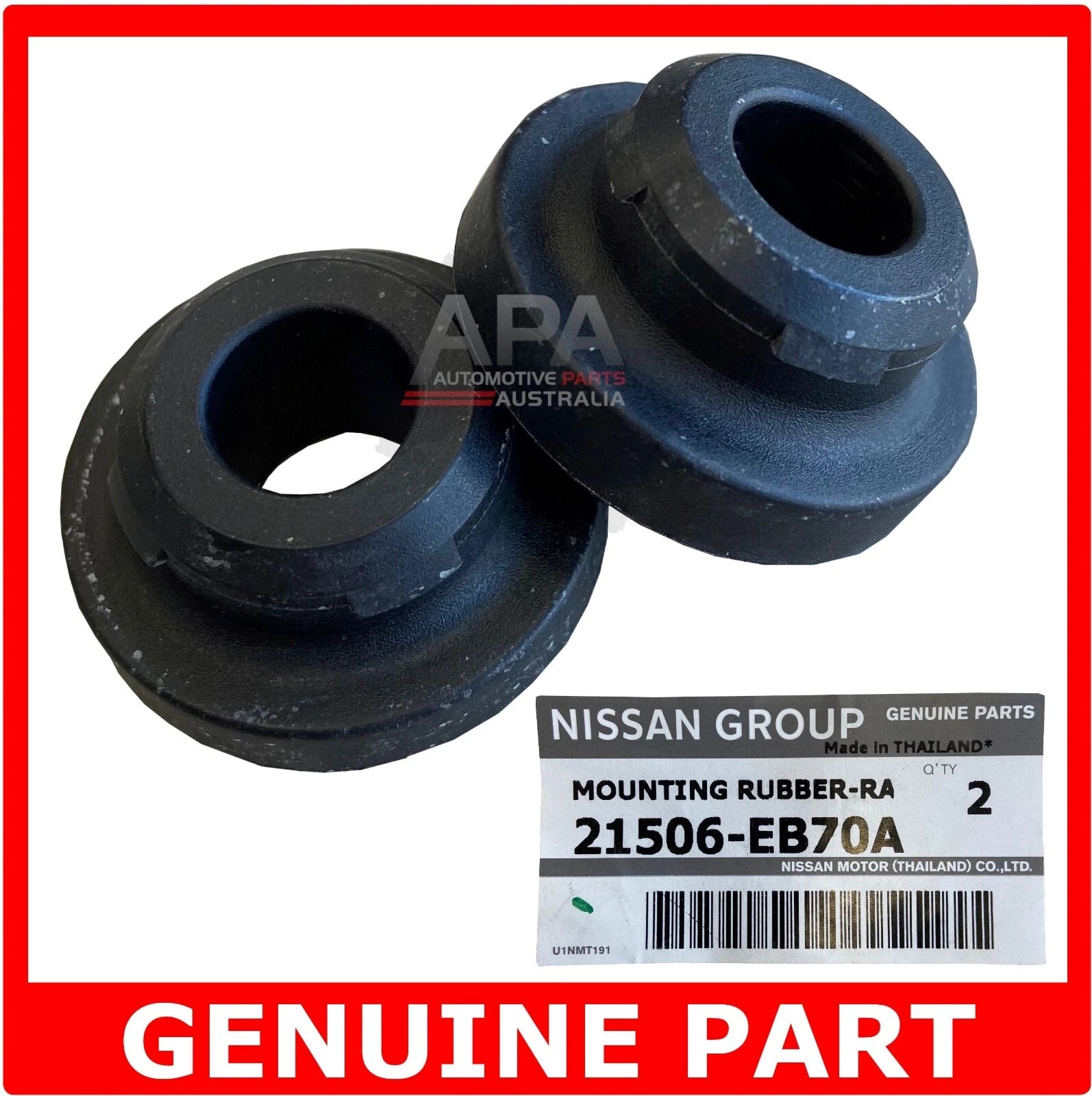 | Item: Genuine Nissan Upper Radiator Mounting RubbersSuits Vehicles: Patrol GU Y61 Navara D22 & D40 Pathfinder R50 & R51 Silvia S13, S14, S15, 180SX & 200SX R35 GTR 350Z & 370Z Part Number: Either 21506-EB70A (x2) or 21506-10V00 (x2) will be supplied depending on supply |