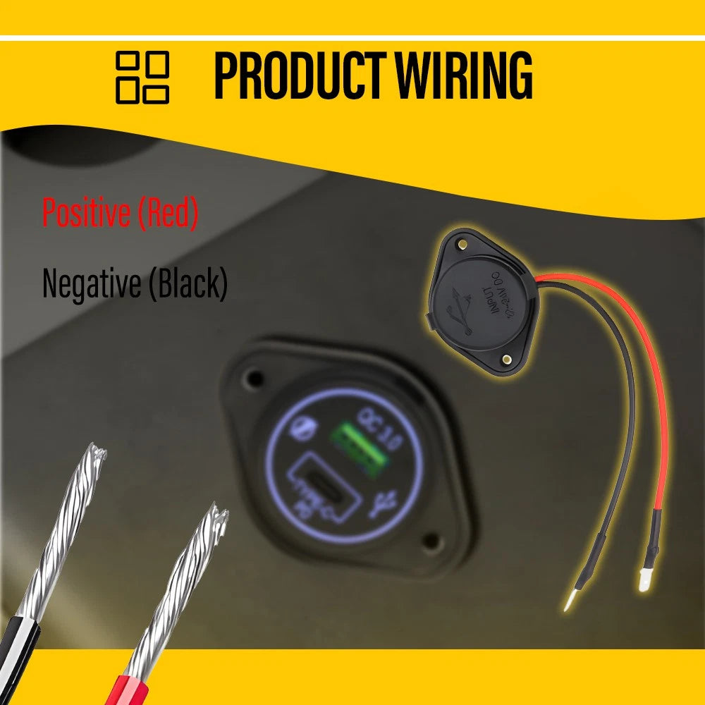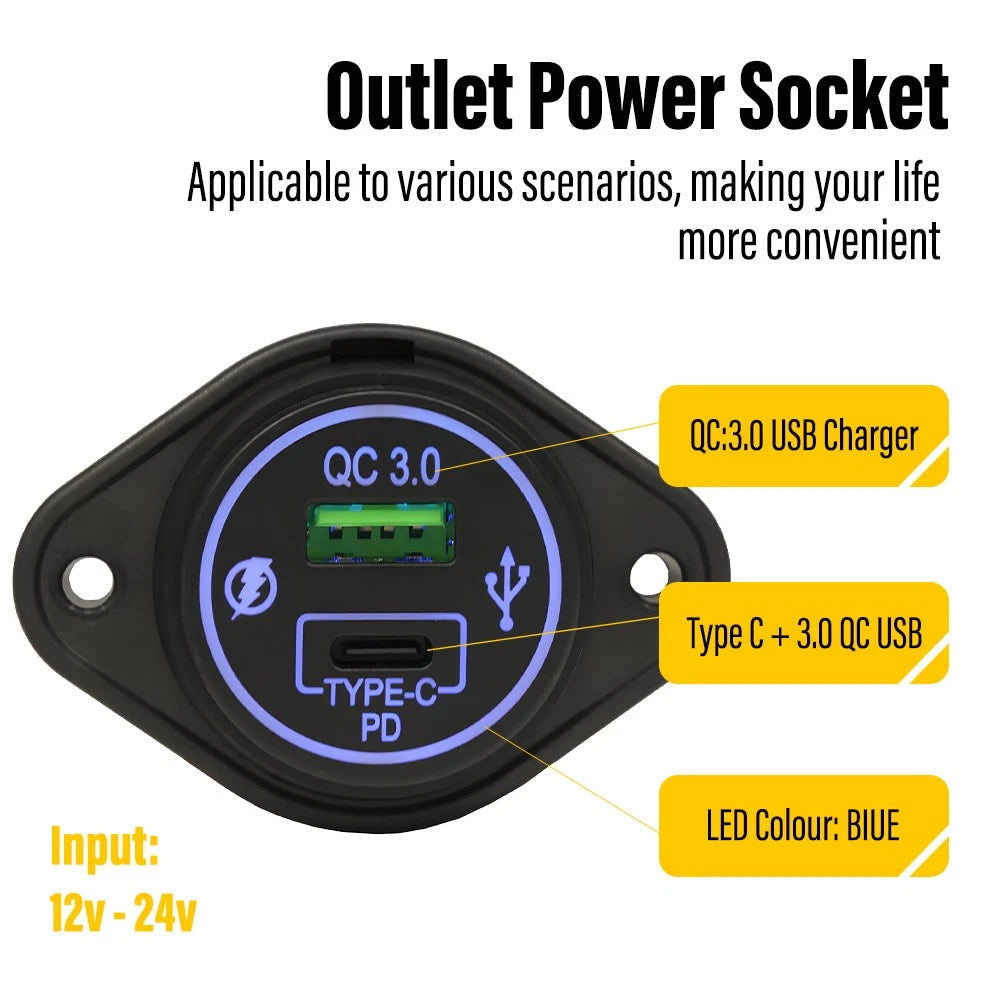 USB-C + QC 3.0 USB - NO LED Surface Mount Panel - 12v QC Outlet Power Socket Fit for: Universal. Suitable for Mobile Devices and USB Accessories. Specifications: Product Material: ABS + electrical components. Panel Material: Plastic / Poly Product Colour: Black Unit Type: Type C + 3.0 QC USB LED Colour: Blue QC 3.0 USB Charger Suitable for Mobile Devices and USB Accessories Input: 12V - 24V Surface Face Size: 64.2mm Wide x 45.6mm High Depth (including dust cover): 24mm 4mm Mounting Holes Mounting Hole Centres: 51mm Wiring Connection: Positive (Red), Negative (Black) wires pre-fitted and pre-terminated with 6.3mm standard male automotive terminals Packaging Weight: 40 g Packaging Sizes (cm): 17 x 14 x 3 Features: *Dual USB Ports for Fast Charging Equipped with Type C and QC 3.0 USB ports, this charger provides fast and efficient charging for mobile devices, tablets, and other USB accessories, ensuring you stay powered up on the go. *Durable & Compact Construction Made with a robust ABS body and plastic panel, this charger is lightweight, durable, and built to withstand daily use, making it a reliable addition to any vehicle. *Easy Installation Designed for hassle-free setup, it features pre-terminated 6.3mm male terminals and surface mounting, making it quick and simple to install on walls, vehicles, or other flat surfaces, even in spaces with limited cavities. *Energy-Efficient LED Indicator Design The blue LED light surface not only adds a sleek look but also improves visibility in low-light conditions, helping you locate the ports easily without consuming excess power. *Multiple Applications With a 12V-24V input range and compact dimensions (64.2mm x 45.6mm face size, 24mm depth), this module is ideal for cars, 4WDs, trucks, boats, etc, offering convenience and versatility wherever you need it. Packaging Incldue: 1 x Type C / USB-C + 3.0 QC USB unit 1 x Panel 2 x Mounting Screws